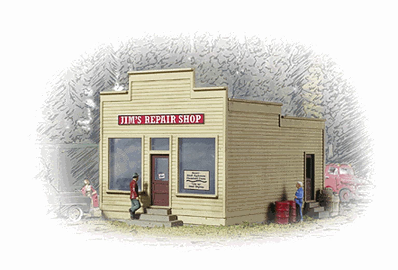 On your layout, the Walthers Cornerstone N Scale Jim's Repair Shop is one of those buildings that fits everywhere. From damaged wheelbarrows to broken sewing machines, Jim can get anything working again.