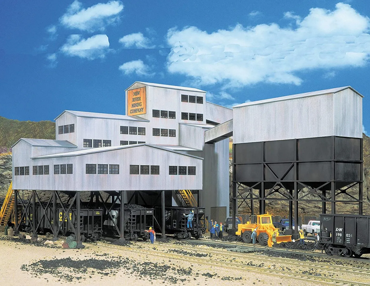 The prototypes for coal mine tipples like the N Scale Walthers Cornerstone New River Mining Company kit are typical of 1950s corrugated structures, many of which are still served today. Based on a trackside coal tipple for loading hoppers or gondolas, this easy-to-build kit features realistic corrugated metal construction, steel supports and separate ladders and stairways. New River is set up to load hoppers on three tracks, and if you're modeling a mine that loads coal trucks for short hauls you can choose to replace a track with a road. The New River Mining Co. also includes a conveyor with supports that can be run underground into the mine or distant mine head. New River Mining is just one of a wide variety of Cornerstone N Scale industrial buildings. - Authentic coal tipple for late steam or diesel eras
