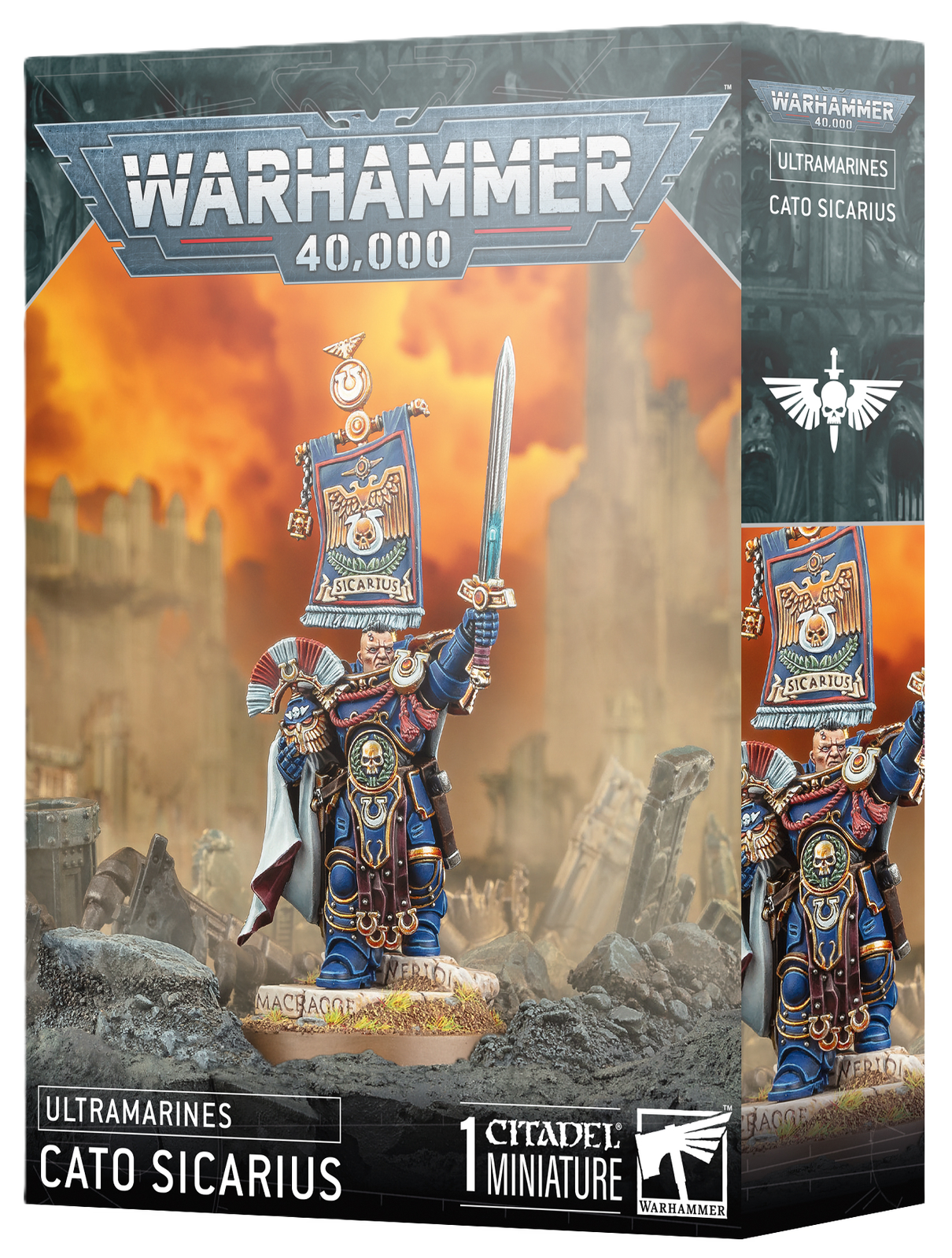 This multipart plastic kit builds Cato Sicarius, a legendary Ultramarines hero for your Space Marines armies in games of Warhammer 40,000. He holds the Talassarian Tempest Blade, carries his ornate helmet in his other hand, and is armed with an artisan plasma pistol to soften up tough foes before he closes in. The kit comes with a choice of two heads offering a degree of customisation for your mighty warrior.
