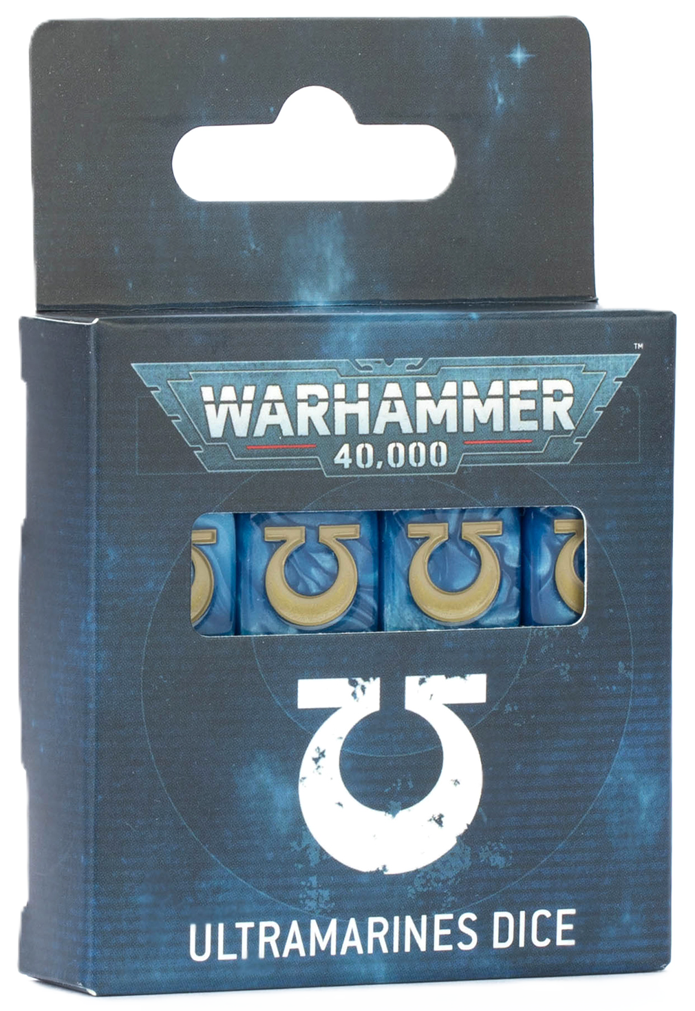 This is a set of 16 six-sided dice with squared edges for use in games of Warhammer 40,000, themed around the Ultramarines. They are cast in pearlised blue acrylic plastic with gold ink markings, and measure 16mm along each edge. The 1-5 facings are traditionally pipped, and each '6' face is decorated with the proud icon of the Ultramarines. This dice set is only available while stocks last.