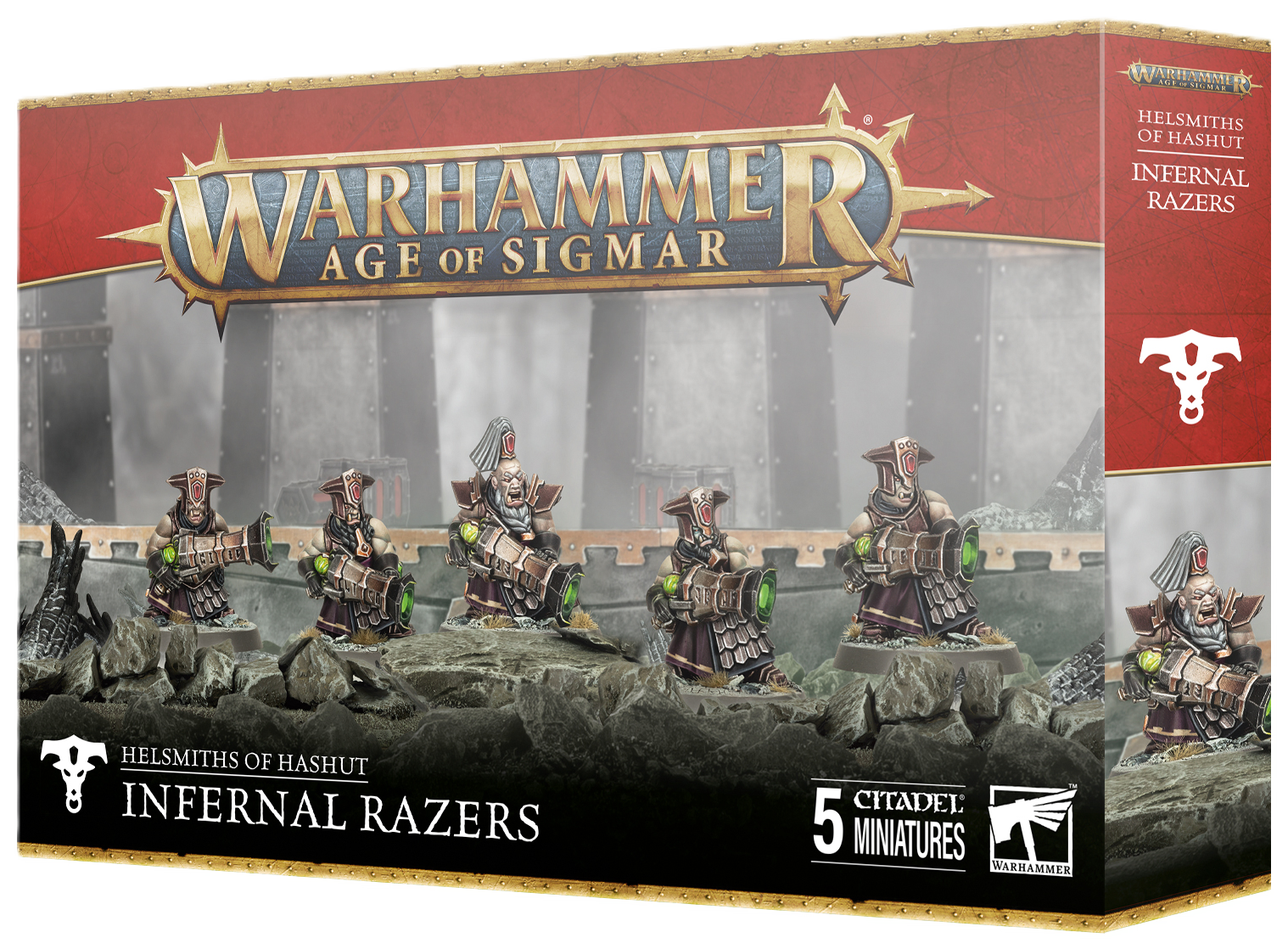 This multipart plastic kit builds five Infernal Razers, infantry wielding heavy firepower for your Helsmiths of Hashut armies in games of Warhammer Age of Sigmar. Heavily armoured and equipped with devastating Grizmalok blunderbusses or light infantry-roasting Karagthrun flamehurlers, they are ready to protect vital objectives and deal death from afar. The kit also includes parts to build an optional champion for your unit of death-dealing warriors.