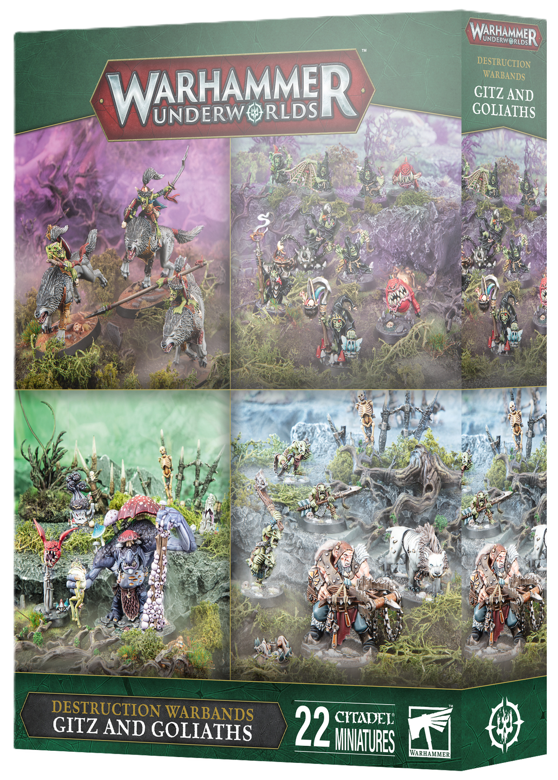 This kit collects four Destruction-themed warbands for Warhammer Underworlds. All the miniatures are push-fit, moulded in coloured plastic, and include scenic bases on the frames so you can start playing quickly. You'll also find warscroll cards and fighter cards for each warband. Hrothgorn's Mantrappers are a versatile Flex warband, Rippa's Snarlfangs are an aggressive Strike warband, Zarbag's Gitz are an ambitious Take and Hold warband, and Mollog's Mob feature the Mastery playstyle, which rewards players for careful management.
