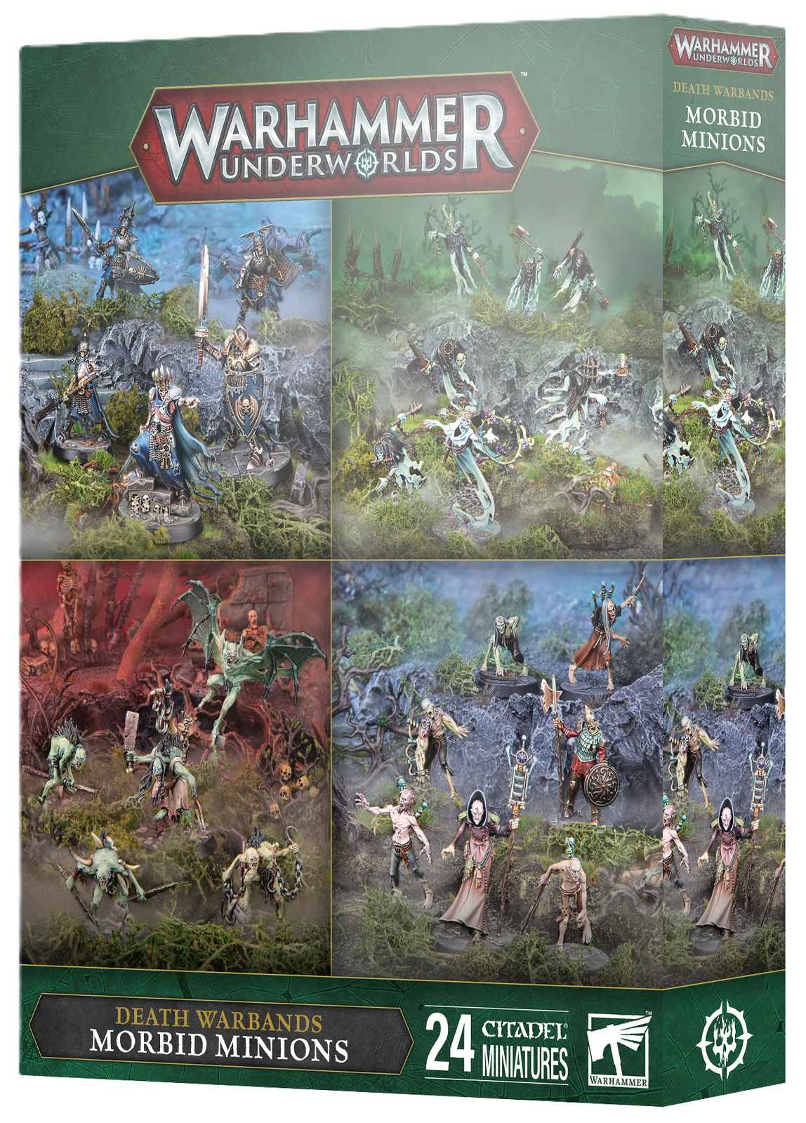 This kit collects four Death-themed warbands for Warhammer Underworlds. All the miniatures are push-fit, moulded in coloured plastic, and include scenic bases on the frames so you can start playing quickly. You'll also find warscroll cards and fighter cards for each warband. The Sons of Velmorn are a versatile Flex warband, and The Skinnerkin are an aggressive Strike warband. The Thorns of the Briar Queen are a tough Take and Hold warband, and The Exiled Dead are a Mastery warband which rewards players for careful management.