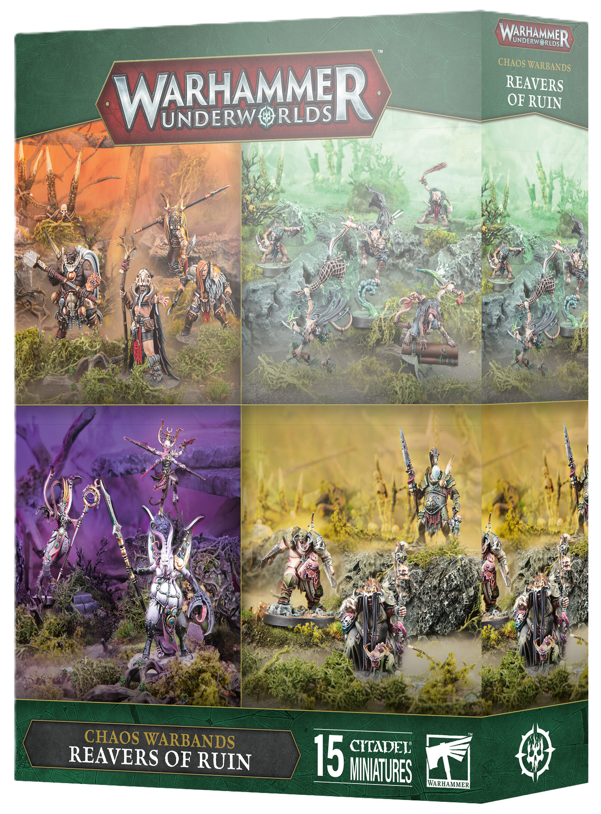 This kit collects four Chaos-themed warbands for Warhammer Underworlds. All the miniatures are push-fit, moulded in coloured plastic, and include scenic bases on the frames so you can start playing quickly. You'll also find warscroll cards and fighter cards for each warband. The Gnarlspirit Pack are a versatile Flex warband, and Skittershank's Clawpack are an aggressive Strike warband. The Thricefold Discord and The Wurmspat feature the Mastery playstyle, which rewards players for careful management.