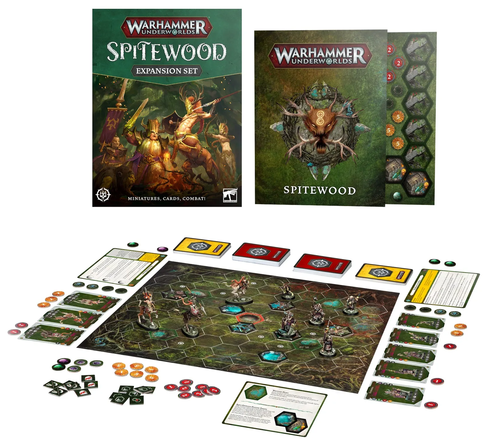 This expansion for Warhammer Underworlds takes you to Spitewood, a labyrinthine forest where the followers of an ambitious Chaos god clash with the hunters of the Sylvaneth. You'll find a double-sided game board that introduces additional game mechanics – reinvigorating Aqua Ghyranis and protective Waystone Hexes, plus two full warbands – the Blood of the Bull, and Kurnoth's Heralds. To make the most of them, one Strike deck and one Mastery deck are also included, along with tokens, fighter cards, and warscroll cards. When combined with the Warhammer Underworlds: Embergard boxed set, available separately, you'll have everything you need to start playing fast-paced, tactical games in the heart of the mysterious Spitewood.