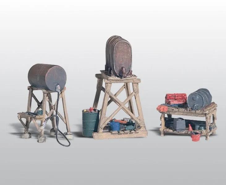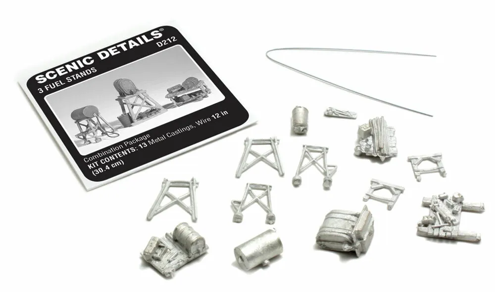 3 Fuel Stands HO Scale Kit Set these gas and diesel tanks out in fields, by barns or by garages. They would look great with decals on them. See our Dry Transfer Decals for ideas. INCLUDES 14 Metal castings Wire 12 in (30.4 cm) Instructions