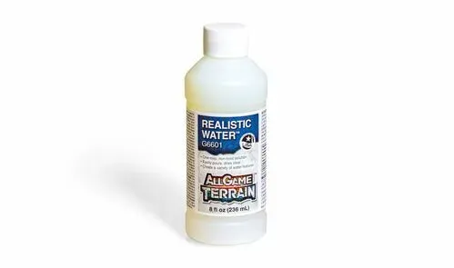 Realistic Water ™ SKU: G6601 Description Realistic Water™ easily pours on your terrain feature, miniature base or gaming mat. This is a one-step solution with minimal shrinkage. Create any water feature you can imagine such as lakes, rivers, puddles and more. Realistic Water is water soluble and non-toxic. 8 fl oz (236 mL) All Game Terrain™ materials are designed for use with a variety of different commercially available miniatures and terrain pieces from other brands and companies such as Reaper Miniatures™, Dungeons & Dragons®, Pathfinder, WizKids®, Warhammer®, Games Workshop®, Citadel™ Miniatures, Vanguard Miniatures, Hero Forge® and more. All Game Terrain is not affiliated with any of these other brands or companies.