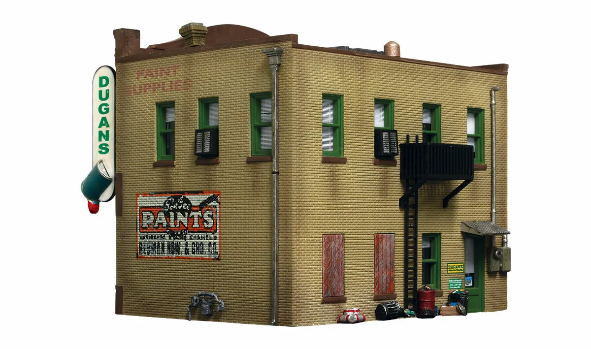 Color your layout's world with Dugan's Paint Store. This building is hand-painted, expertly weathered and loaded with architectural detail. Accessories include full roof detail with ductwork, custom signage, colorful awnings, benches, a fire escape and more! Includes window treatments, dry transfer decals and a first-floor printed interior. See photos for footprint.