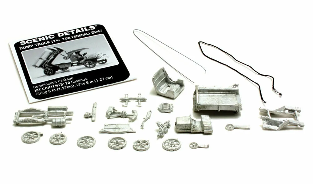 Dump Truck (1 1/2 Ton Federal) HO Scale Kit This model replicates the earlier dump trucks with their crank operation and steel wheels. Set this on your layout with gravel, dirt or junk in the back for a realistic look. INCLUDES 20 Metal Castings String 6 in (1.27cm) Wire 6 in (1.27 cm) Instructions