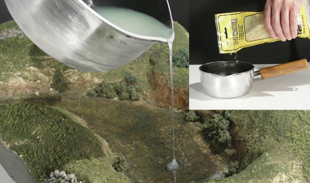 E-Z Water is a great solution for easy, fast and flat surfaces. There is no need for measuring or mixing. Just melt E-Z Water and pour to create ponds, streams, rivers and harbors. E-Z Water hardens in minutes and is easy to tint with powdered fabric dye. It is a low odor, non-toxic, plastic product that comes in the form of pellets.