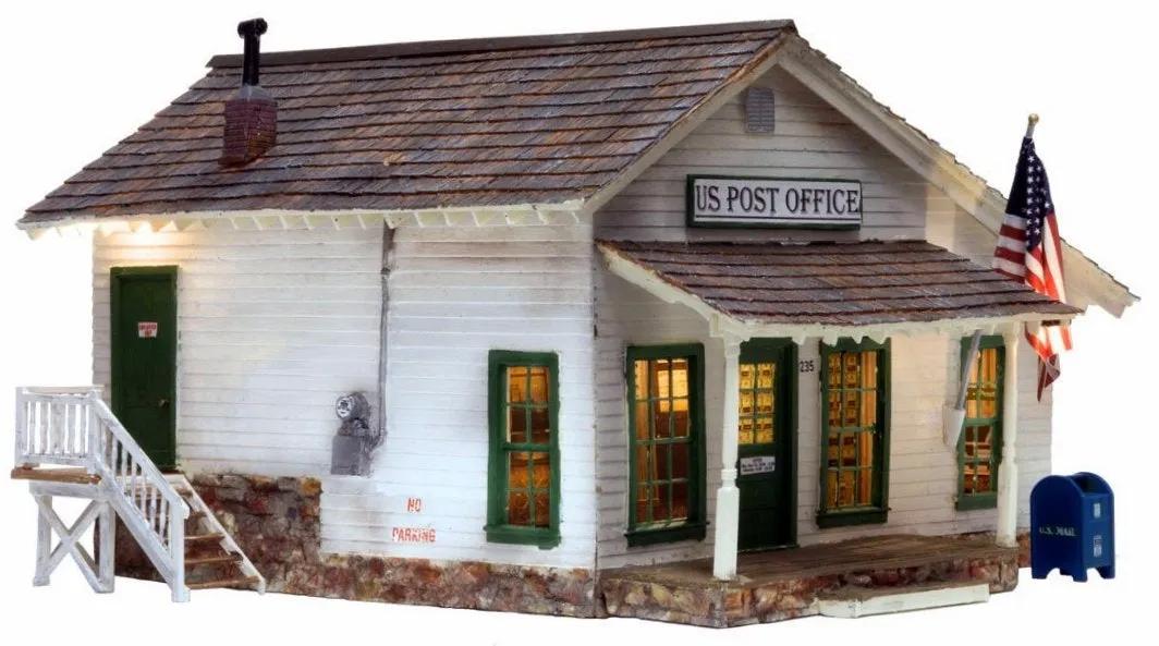 Whether you're sending a letter or patiently waiting on a package, Letters, Parcels & Post is there for all of your mailing needs. Includes a rugged stone foundation, plenty of windows for showing off the printed interior and a light for highlighting the flag. A covered porch provides a place to wait when the lines are long and a set of stairs lead to a side door. Additional features include a chimney, rear loading dock and an unattached mailbox for dropping off mail at any time of day.
