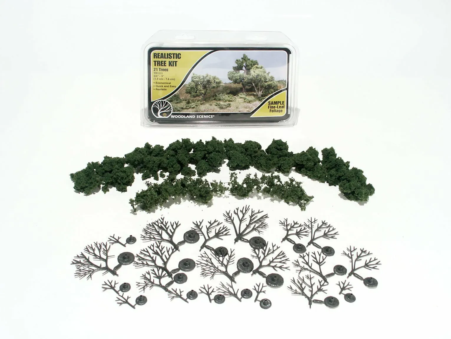 Medium Green Realistic Tree Kits teach you to easily make unique deciduous trees ranging from 3/4 to 7" (1.9 cm - 17.7 cm). Simply bend and twist the armature's branches in the shape you want. Apply Hob-e-Tac® and wait until clear and tacky. Drying times can vary due to humidity conditions. Once dry, dip armature into foliage or press foliage onto branches.