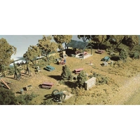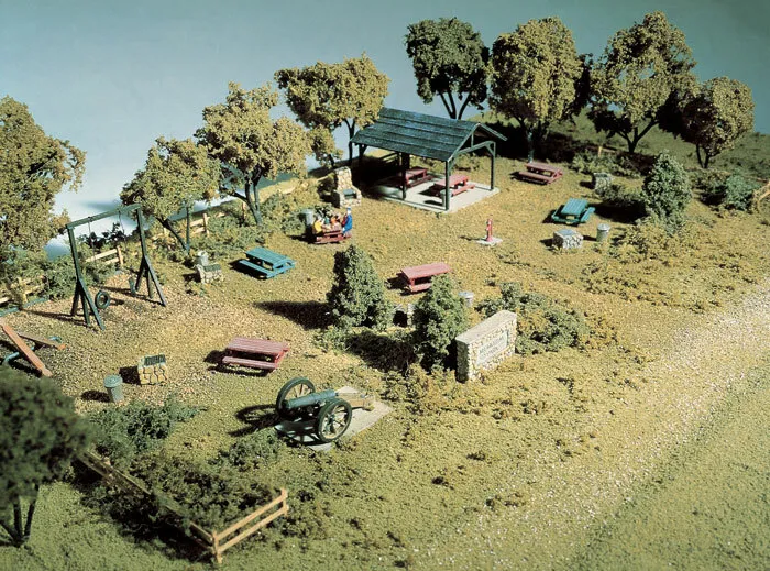 Memorial Park HO Scale Kit A small community would not be complete without a place to get together on those warm summer evenings. Thirty-eight white metal castings, nine trees, foliage, turf, and the materials for fence and shed are included in this 8" x 14" (20.3 cm x 35.5) scene. Colors may vary from actual product. INCLUDES