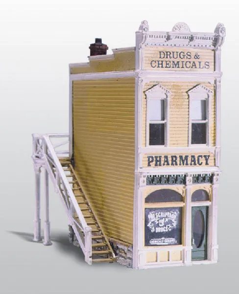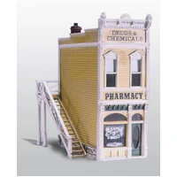 Pharmacy HO Scale Kit This quaint shop is a replica of those in early America, which carried all of the pharmaceuticals and chemicals that were needed in small towns. 3 1/4" long x 3 3/4" tall (8.25 cm x 9.52 cm) INCLUDES 17 Metal castings 1 sheet Basswood 1 sheet Cardstock 1 sheet Window Material 1 sheet Dry Transfer Decals