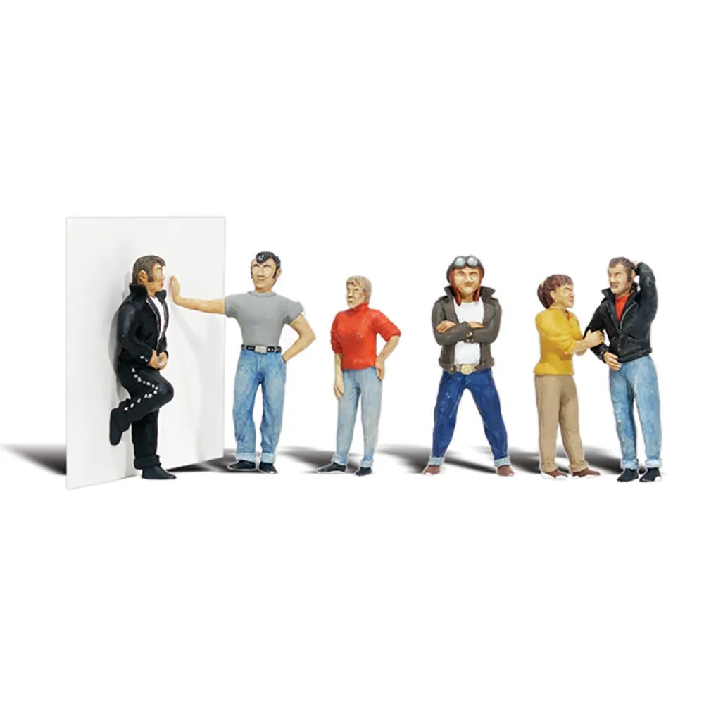 A cool couple stands together, arms entwined, while the man fixes his hair. Another couple stands together: his arms are crossed and her hand rests on her hip. One man leans with his hand on the wall. Another man adjusts his leather jacket.