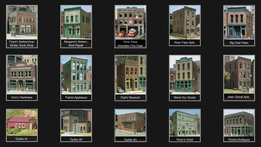 A collection of 15 individual, architecturally detailed HO scale building kits. The kit includes more than 200 accessories, 110 Dry Transfer Decals and 20 signs and posters. Though created for River Pass, these buildings will create an authentic city environment on any HO layout.