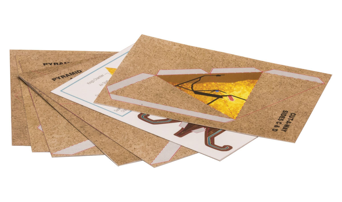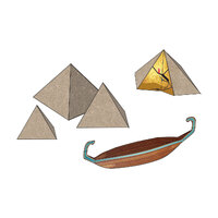 Pre-cut graphics and materials to make pyramids and an Egyptian boat. Kit contents are easy to assemble.