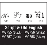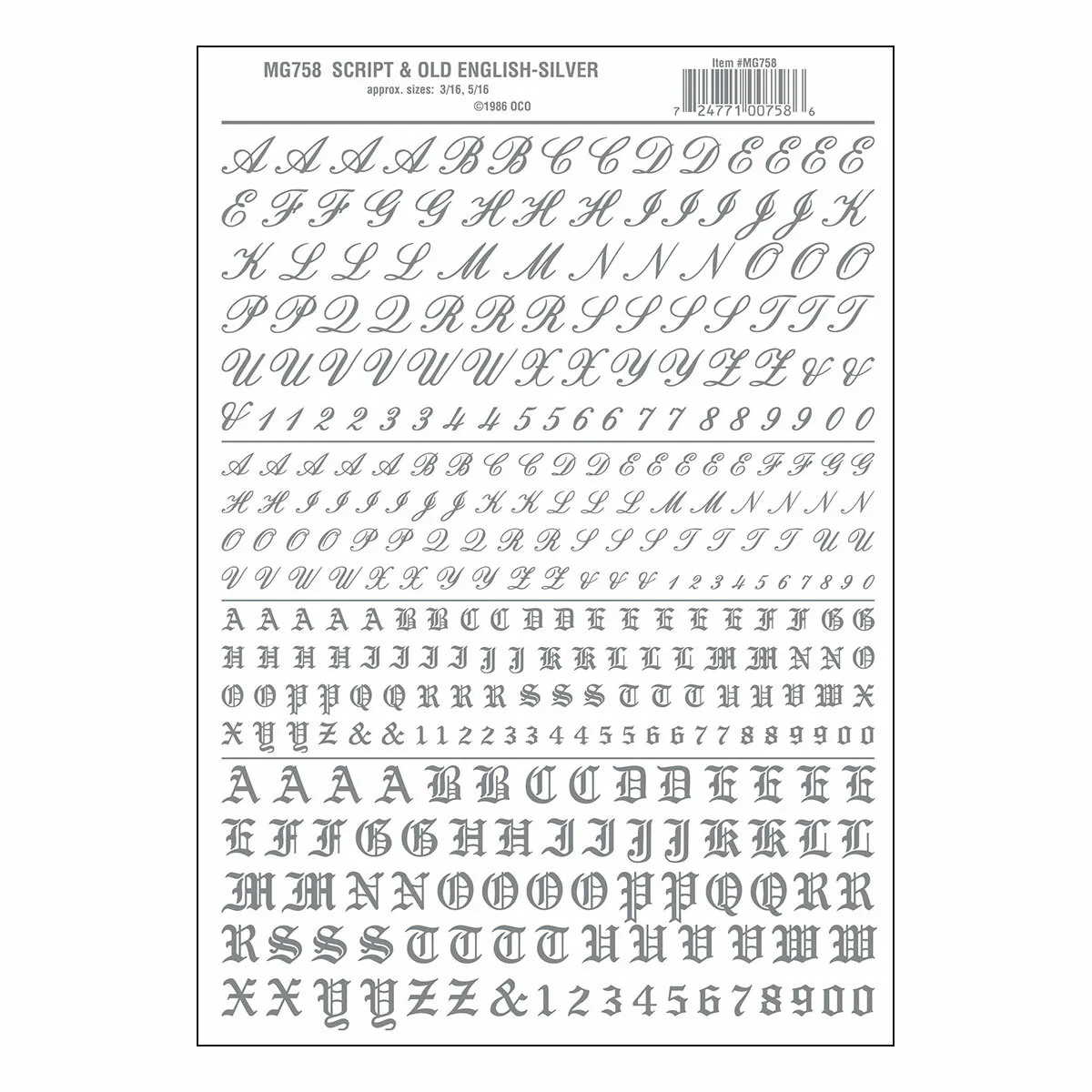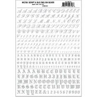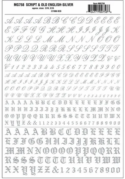 Script & Old English Silver Package contains one sheet. Sheet size: 5 5/8 in x 8 1/4 in (14.2 cm x 20.9 cm) Script Letter sizes: 3/16 in and 5/16 in (4.7 and 7.9 mm) Old English Letter sizes: 3/16 in and 5/16 in (4.7 and 7.9 mm) INCLUDES