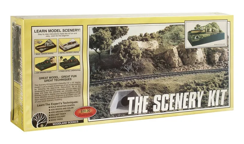 The Scenery Kit Build a 10" x 18" (25.4 cm x 45.7 cm) HO scale diorama and learn easy terrain and landscape modeling techniques that you can apply to your future models and layouts. This kit includes: complete step-by-step instructions, pre-cut hardboard sides, Plaster Cloth, Rock Castings, Culvert, Lightweight Hydrocal®*, four colors of Earth Colors™ Liquid Pigment, Scenic Cement™, Track-Bed, Hob-e-Tac®, Adhesive, Ballast, HO scale track (others can be substituted), five colors of Turf, two colors of Clump-Foliage™, three realistic Tree Armatures, Talus, Poly Fiber and Field Grass. Display an engine or piece of rolling stock on the finished diorama. Saves over purchasing items separately. Train not included. *Hydrocal® is U.S. Gypsum registered trademark. INCLUDES 4 Pre-cut side frames: 1/8" thick hardboard 5 Corner Blocks 1 Pre-cut Sub-roadbed piece: