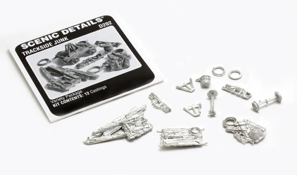Free Shipping For Orders Over $150 To Metro Areas* (Online orders only)No trackside scene would be complete without the addition of piles of scrap unpainted metal, old ties, railcar pieces and more. Set contains 12 unpainted metal castings