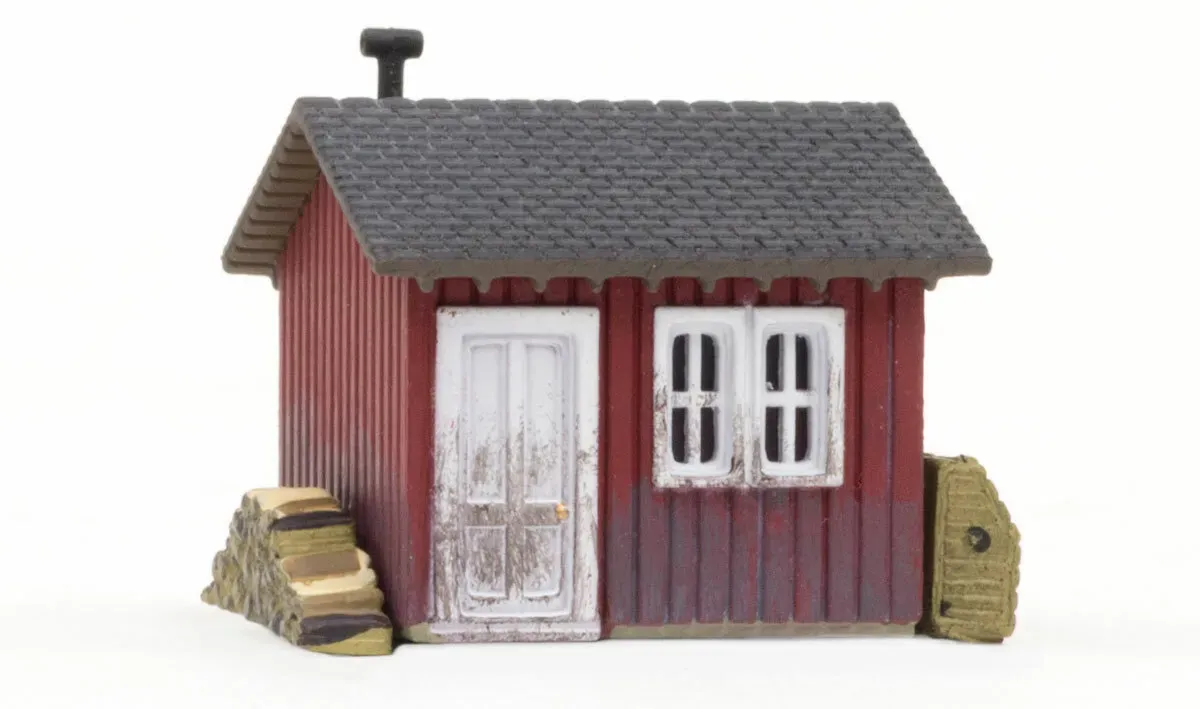The original 'man cave' was a work shed just like this one. Nothing too fancy- just a red, four-walled building with enough room for a shelf and two windows. Includes shake shingles, a smokestack, exterior storage box and a stockpile of wood for those colder days.