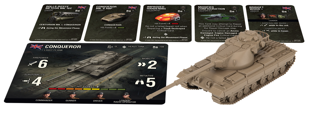 Inside the Conqueror, you will find a highly detailed, assembled, pre-primed plastic Conqueror tank miniature and tank card. Your tank can be further personalised to match your requirements using the five crew, module, and upgrade cards included.