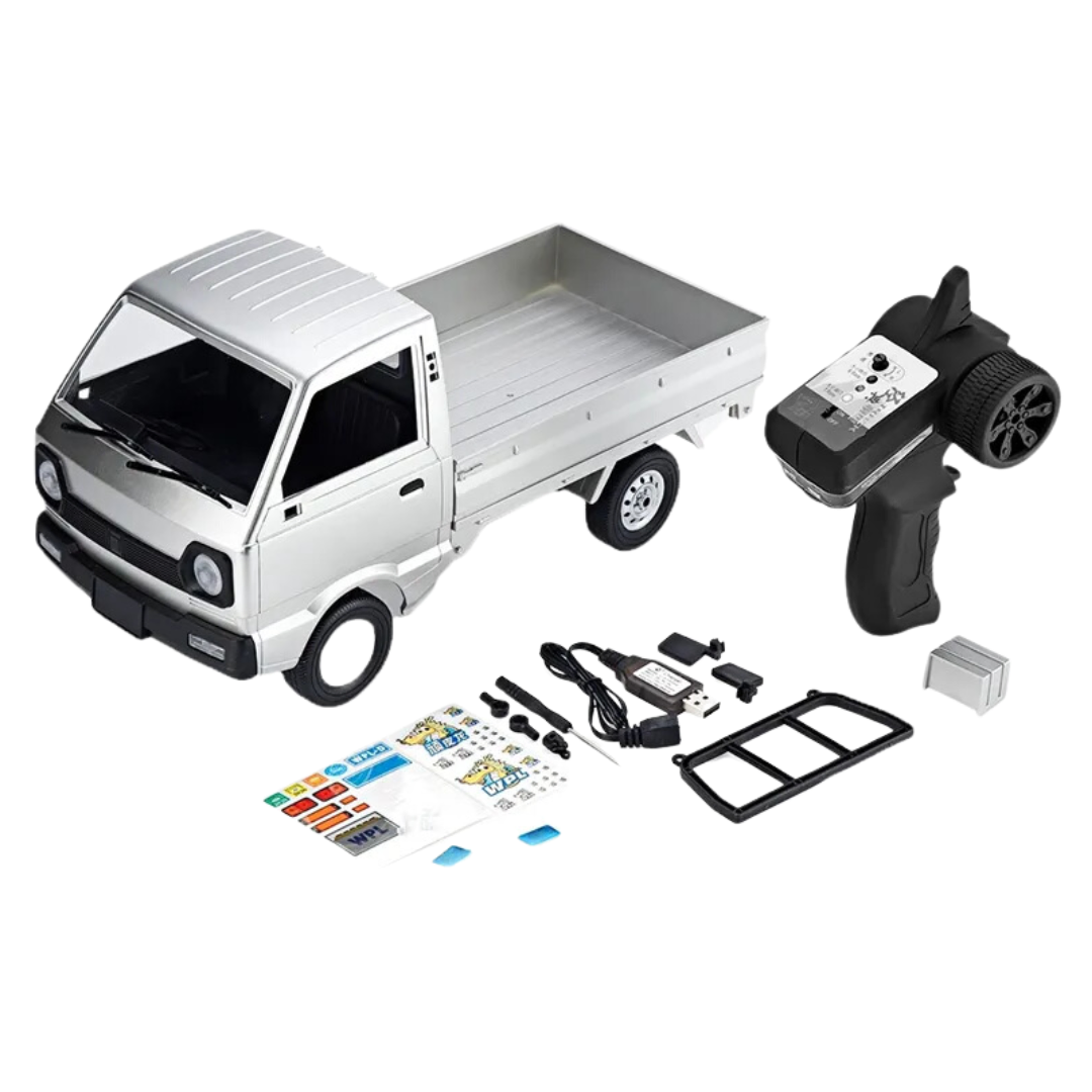 The WPL D12 RC Kei Drift Truck comes with everything you need in the box - all you need to add is 2 x AA batteries for the controller. With features like a high power motor, front double-wishbone independent suspension, adjustable front and rear inclination and camber angles, rubber tyres, LED headlights and a detachable spare tyre, the WPL D12 is not only durable and capable but has an outstanding appearance. The 2.4Ghz controller provides high frequency, high control accuracy and rapid response as well as the ability to drive multiple remote control cars at once without interference.